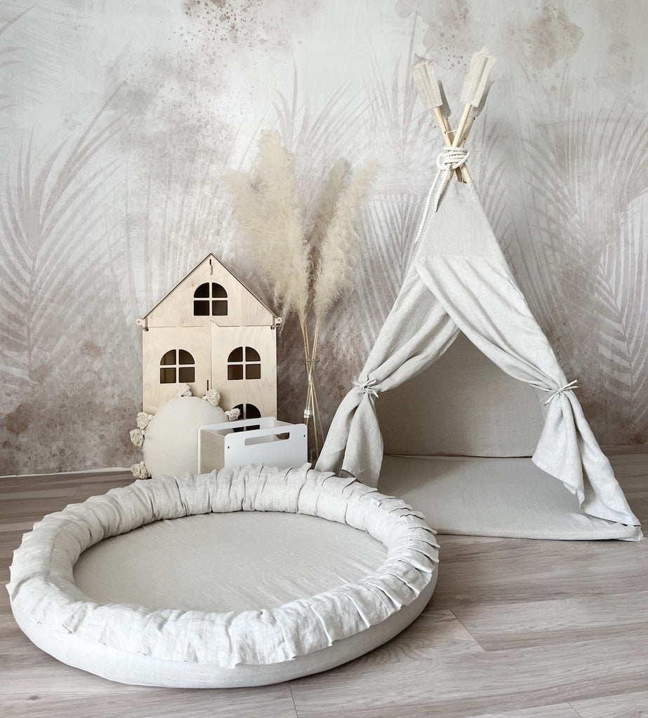 Un coin douillet pour se détendre, jouer ou lire un livre. Apprécié des enfants, ce tapis d'éveil est un bel ajout à tout intérieur grâce à son design intemporel et son élégant tissu en lin. Comprend un tapis d'éveil en mousse .